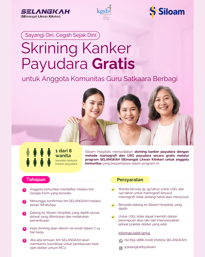 Melalui kolaborasi Komunitas Guru Satkaara Berbagi (KGSB) dan program SELANGKAH (SEmangat LAwan KANker) by Siloam Hospitals, perempuan Indonesia terutama guru maupun keluarga dan kerabatnya kini bisa mendapatkan skrining kanker payudara GRATIS dengan metode USG atau mammografi.